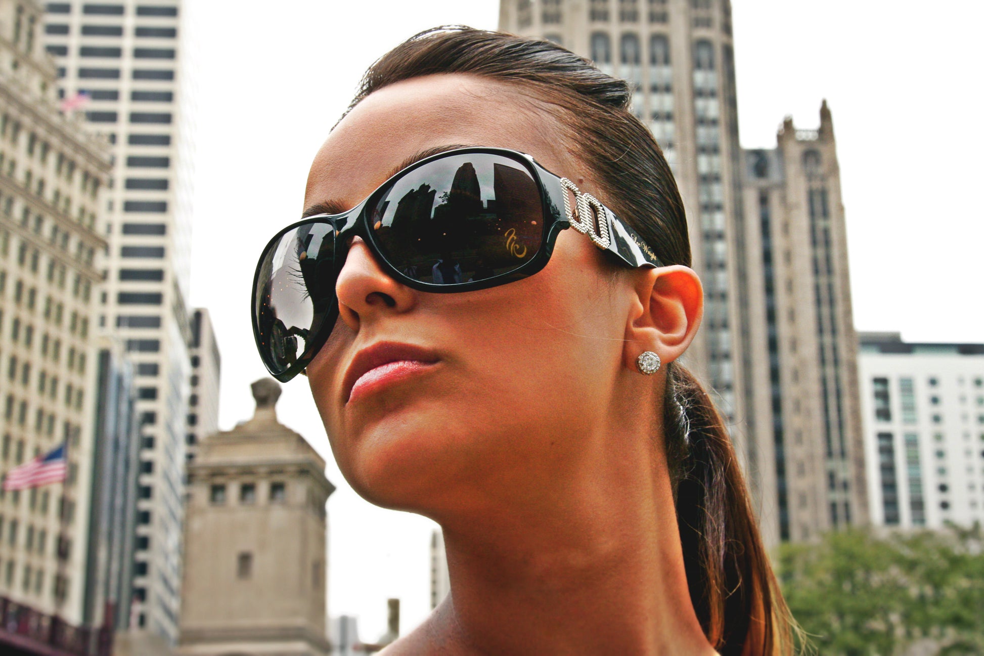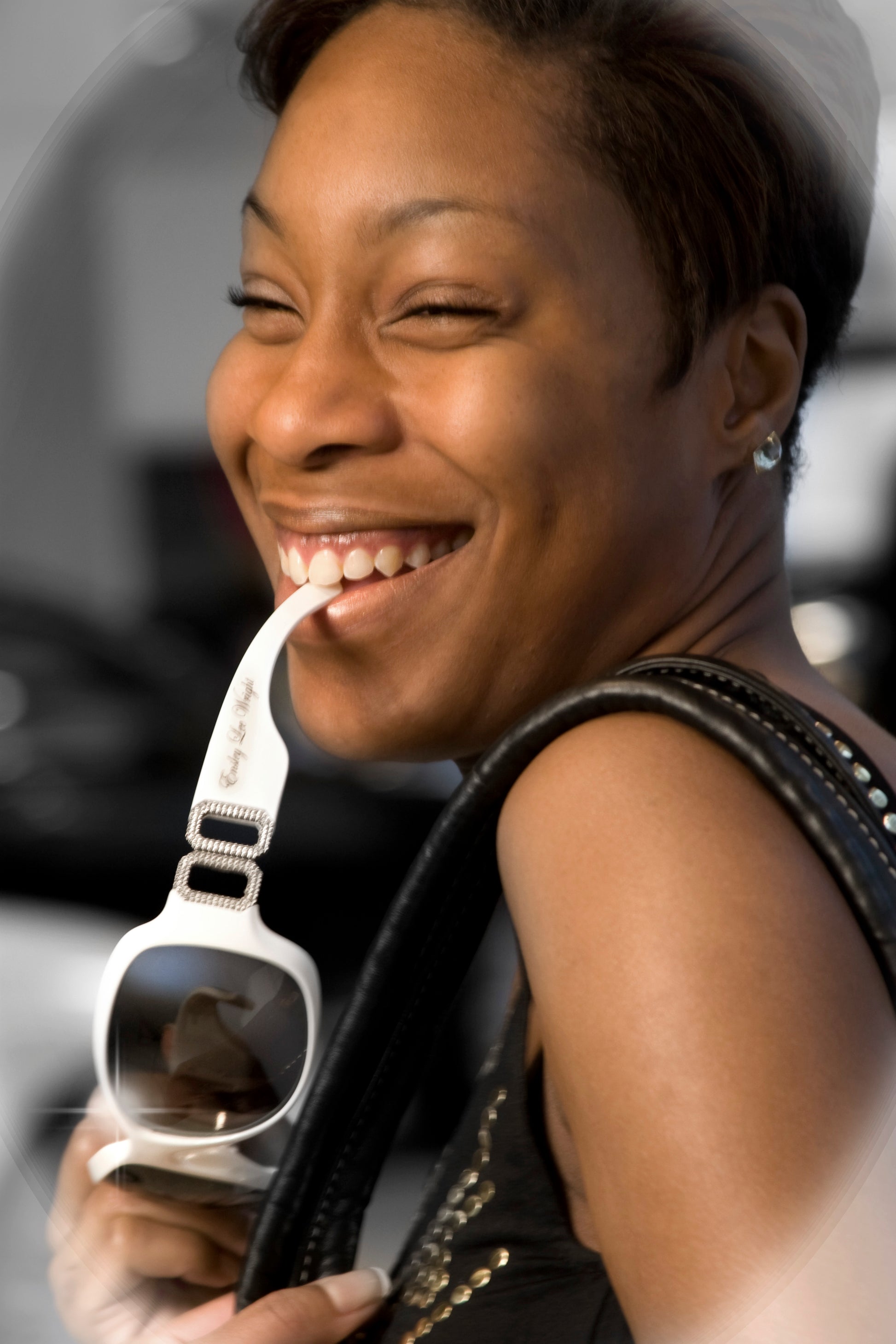 Elegance Black or White woman sunglasses $25 plastic style frame with silver accent attaching arm of glasses. Has a UV 400 lens 100% protection against ultra-violet rays with gold logo & brand name. Black or White frame/ sliver accent attachment / gold logo and brand name. Made in Taiwan